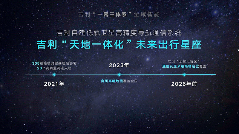 智能汽车软硬件体系下,数据才是用户体验进化的源动力。吉利自建的地轨卫星高精度导航系统目前已完成305座高精时空基准站的部署。计划2026年前,完成物联通信卫星及导航增强低轨星座组网,实现“全球无盲区”的通信及厘米级高精定位覆盖。由吉利测绘采集的高精地图,将在2023年覆盖全国,未来将持续为“智能吉利科技生态网”提供“天地一体”的数据和算法验证。