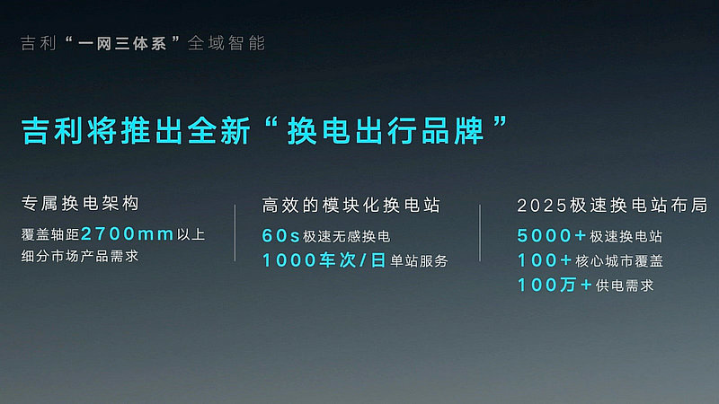 同时,吉利在“换电架构、换电站、换电车辆”领域已经拥有上千项技术专利,并参与了国家换电标准的制定。基于专属换电架构,吉利还将推出全新“换电出行品牌”。到2025年,实现100个核心城市布局5000座极速换电站,满足100万辆车的换电需求。