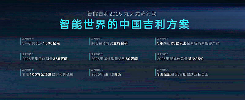 为加速吉利“一网三体系”的成果持续落地, 吉利公布了吉利汽车集团“九大龙湾行动”,保障“智能吉利2025”战略全面落地实施。