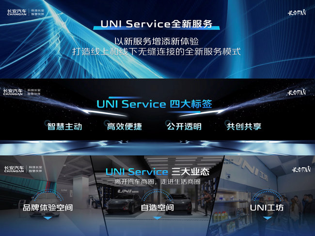UNI Service是线上线下全场景融合的创新业态,不仅如此,UNI Service提供智慧主动、高效便捷、公开透明、共创共享的高体验服务场景,同时,UNI Service还是长安汽车始终将客户视为品牌合伙人,与客户共同成长,相互成就的重要平台。