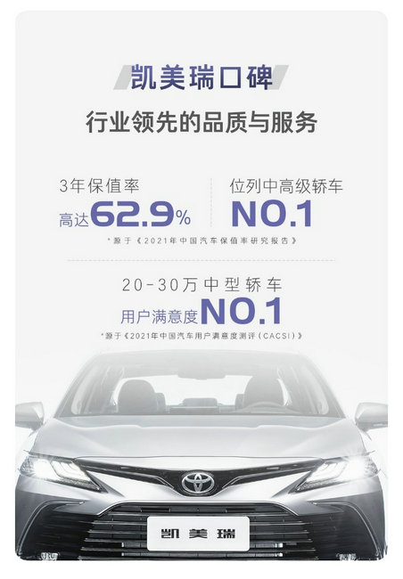 除了不断突破革新的产品力,行业领先的高品质和服务也是凯美瑞持续热销的重要保障。得益于高品质,凯美瑞养护成本远低于同级车型,保值率在细分市场名列前茅。在《2021年中国汽车保值率研究报告》中,凯美瑞3年保值率高达62.9%,位列同级第一。服务方面,在《2021年中国汽车用户满意度测评(CACSI)》中,广汽丰田再次蝉联销售和售后服务满意度双料冠军,凯美瑞蝉联20-30万中型轿车汽车用户满意度第一。