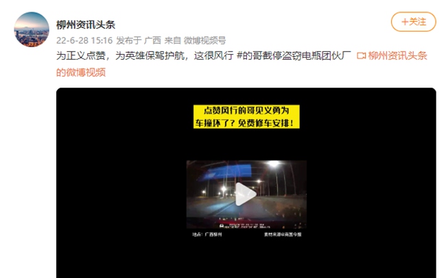 6月27日凌晨“柳州的哥”李师傅在出车时发现盗窃电瓶的团伙,在报警求助后协助民警截停一台满载可疑电瓶的电动车。在见义勇为的过程中,李师傅所驾驶的车辆有多处受损,东风风行快速行动,为李师傅提供了免费修车服务。社会需要弘扬正气,见义勇为者的权益更需要得到保障。此次东风风行宣布成立“风行者计划——百万正能量基金”,正是风行自发通过公益行动为正能量车主服务。