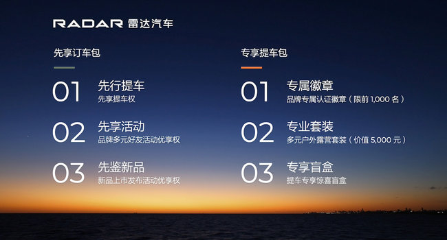 准车主福利进行时!雷达RD6将于今年上市,现在“0元预定”通道已开启。首批预订用户,可享受优先提车权、品牌多元好友活动优享权、新品上市发布活动优享权等先享订车礼包,还可获得雷达汽车官方App品牌专属认证徽章、惊喜盲盒、价值 5000 元的多元a户外露营装备等专享提车礼包。即刻,开启多元户外精彩生活。