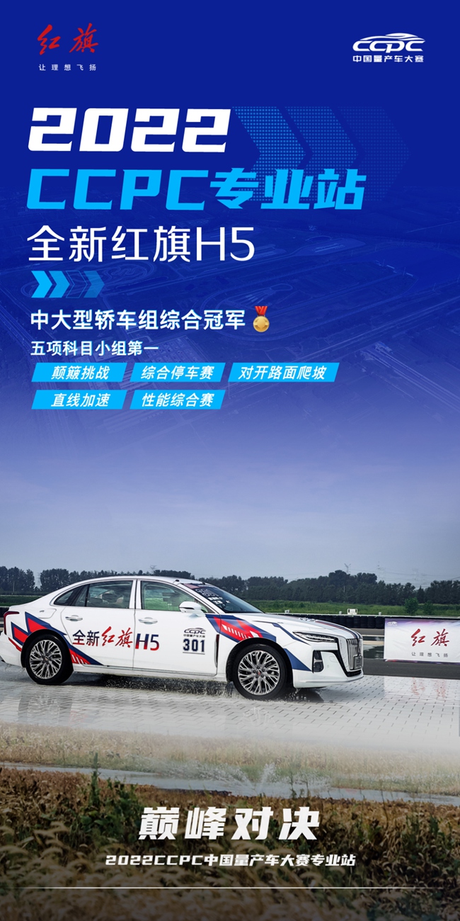 风驰电掣,一骑绝尘!8月28日,中国量产车性能大赛(以下简称CCPC)2022年度专业站竞赛再传喜讯:经过与一众实力派车型两天的激烈角逐,全新红旗H5不负众望,在9个单项赛项目中夺得5个第一,成功卫冕中大型轿车组综合冠军。