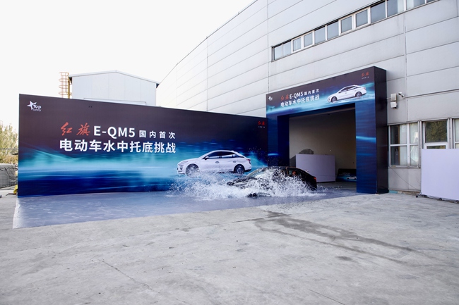 红旗E-QM5电动车水中托底挑战的难度是在于车辆电池已经受到一次碰撞后再次经受严苛挑战,在水中进行二次碰撞,对电池的密封性,电池外壳都会造成很大的冲击,极大的考验着电池的防护能力。