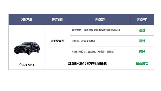日前,红旗E-QM5在中国汽车技术研究中心有限公司实车碰撞试验室举行的电动车水中托底挑战试验中,顺利通过严苛检验,全面地揭示出车辆在涉水并发生底部碰撞后,产品电池包所展现出的安全性与可靠性。