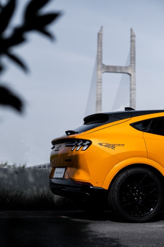 福特电马GT风暴复古版让Mustang Twister以纯电形式再次回归了大众的视野,重新设计且更符合当代审美的旋风标识,点缀于黑色街车式拉花与啸日橙的车身上,搭配全铝亮黑轮毂和发光轮毂盖,整体设计主题以潮流向经典致敬。
