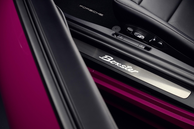 不仅是星光宝石红Neo,无论客户为自己的Style Edition车型选择哪款漆色,都能令爱车展现与众不同的光彩。例如,选用高光黑色20英寸718 Spyder车轮,搭配彩色保时捷盾徽轮毂盖。Style Edition的标志性设计还包括运动型排气系统尾管,以及尾部的高光银色“Porsche”字样。在718 Boxster Style Edition上,原本镶嵌于侧窗上方的“Boxster”字样现在被加到了软顶上,成为这一车型的特殊细节。718 Style Edition提供两款对比色组件——白色和黑色——任选其一且无需额外费用。两款组件均包含前行李厢盖上的装饰条、车身侧面的“Porsche”装饰字样,以及车轮和尾部车型标记的黑色或白色高光漆饰。Style Edition在车内采用了一款黑色真皮组件,包含哑灰色的对比色缝线、带照明的不锈钢车门槛护板,以及头枕上的保时捷盾徽。