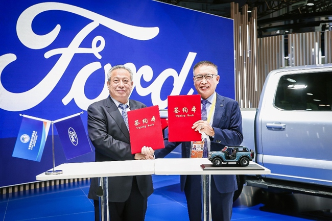 进口博览局副局长、国家会展中心(上海)党委书记、副总裁刘福学和福特中国总裁兼首席执行官陈安宁在展台签约