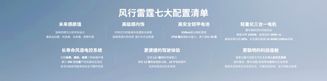 风行雷霆带来了七大配置清单。一是未来感颜值,风行雷霆以独特的跨次元机甲风设计,打造兼具运动感、科技感、未来感的车身姿态,让车主秀出年轻新主张,轻松站上潮流舞台C位。二是高级感内饰,风行雷霆环抱式中控营造了极具科技感和未来感的内饰氛围,再加上超高质感内饰材质进一步提升了车内的品质感。三是长寿命铠甲电池,风行雷霆坐拥630km超长续航里程,电池具备IP68级超强防水能力,全面消除用户的里程焦虑和安全顾虑。四是轻量化三合一电机,峰值功率150kW,峰值扭矩340N·m,最高效率达到了98%,整车能耗领先同级竞品。