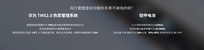 首先,风行雷霆首搭华为TMS2.0热泵管理系统,可适用零下18℃以下的超低温环境,相比行业低8℃,使得冬季续航提升16%。其次,风行雷霆所搭载的铠甲电池,充电1次,CLTC续航里程至高可达630km。电池包整包最高容量可达85.9kWh,能显著提升整车的续航能力。可以毫不夸张地说,风行雷霆就是为解决冬季续航痛点而生,真正实现冬季也不掉电。
