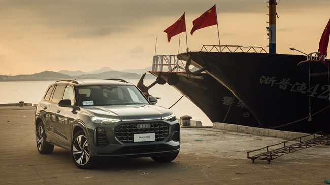 迎风前行的魅力藏在舟山群岛的每个角落,也通过“硬悍豪华全尺寸SUV”的豪迈实力尽情释放。硬朗的车身线条、熏黑的外观套件、大尺寸轮毂等年轻感和运动张力共存的车身细节,奥迪Q6以独有的方式诉说着机械之美,与一旁的船舶首舷相得益彰。承袭经典奥迪家族式语言,奥迪Q6还融入了品牌全新的SUV设计理念,超大车身尺寸配合中国传统神话意象加以精心雕琢,气宇轩昂之姿使它熠熠生光。