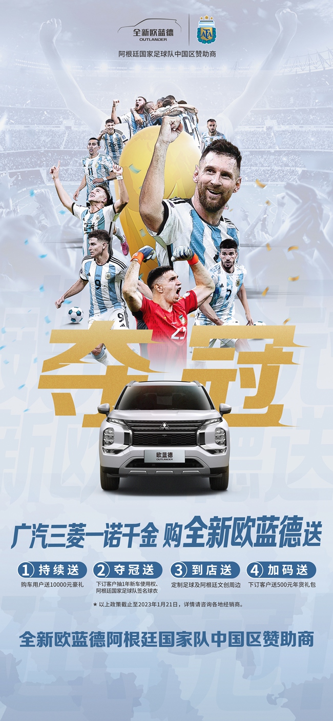 如今,全新欧蓝德已在全国各地陆续交付。作为阿根廷国家足球队中国区赞助商,广汽三菱全新欧蓝德为祝贺阿根廷夺冠还推出了购车加码福利,有意向的车友千万不要错过!车友们只需在春节前(2023年1月21日)成交提车,即可享受以下四重权益(具体权益详情请咨询各地经销商):