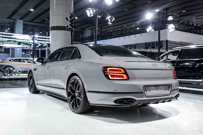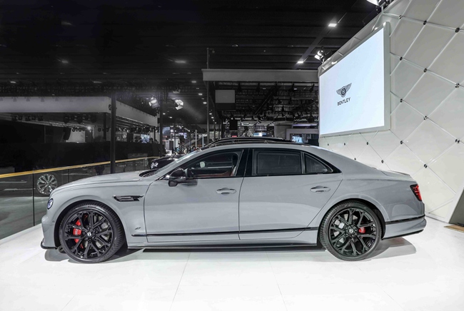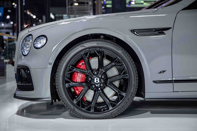 宾利飞驰S车型提供丰富的外观和内饰选择,以满足客户对于个性化超豪华座驾的无限遐想。亮相本次车展的宾利飞驰S车型,外观设计动感鲜明而又低调内敛。寒武岩灰(Cambrian Grey)车身漆色搭配黑色抛光饰件,包括亮黑色保险杠下部格栅、黑色前大灯和尾灯、黑色四出式排气管,和前翼子板上醒目的S版车型专属徽章,尽显运动格调。该车采用亮黑色设计的直瀑式进气格栅,饰有亮黑边框饰条,装配22英寸十幅运动式全黑色喷漆轮毂,客户也可按需将其替换为S车型专属的21英寸三辐轮毂,不论选择何种轮毂款式,标配的红色制动卡钳令S版车型突显运动风范。