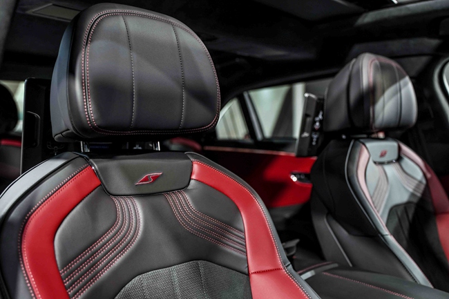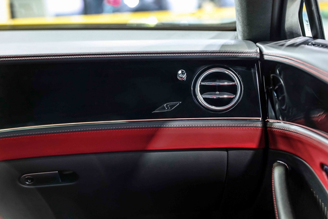 该车的奢华座舱内饰引入热刺红(Hotspur)与鲸鱼黑(Beluga)的双色配色方案,由宾利工匠结合光滑的天然皮革与仿麂皮质感的柔软Dinamica材质手工制作而成,颇具运动气质,同时为座舱带来兼具光滑与柔软的精妙触感。该车型的加热式方向盘、换挡杆、座垫和座椅靠背均包裹以Dinamica可持续超细纤维材质,而座垫侧围、车门衬垫、仪表板和中控台周围则选用天然皮革打造。所有座椅靠背上均饰以“S”字样的刺绣图案,客户也可免费将其替换为宾利双翼徽标刺绣。驾驭者面前的仪表盘设计灵感源自赛车计时器,仪表板和宾利照明式迎宾踏板镶嵌“S”字样金属徽章,彰显S版车型的专属气韵。