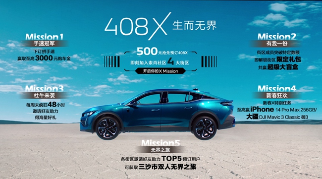 伴随东风标致408X的首秀,新车抢先预订也同步开启。消费者可通过官方平台(东风标致超级APP和 “东风标致狮王联盟”小程序)进行线上抢先预订。入驻索肖社区,加入首批开放的“自驾露营、街舞滑板、潜水冲浪、萌宠生活”4大街区,500元抢先预订408X,开启自己的X Mission,还可领取超多抢先预订专属福利。