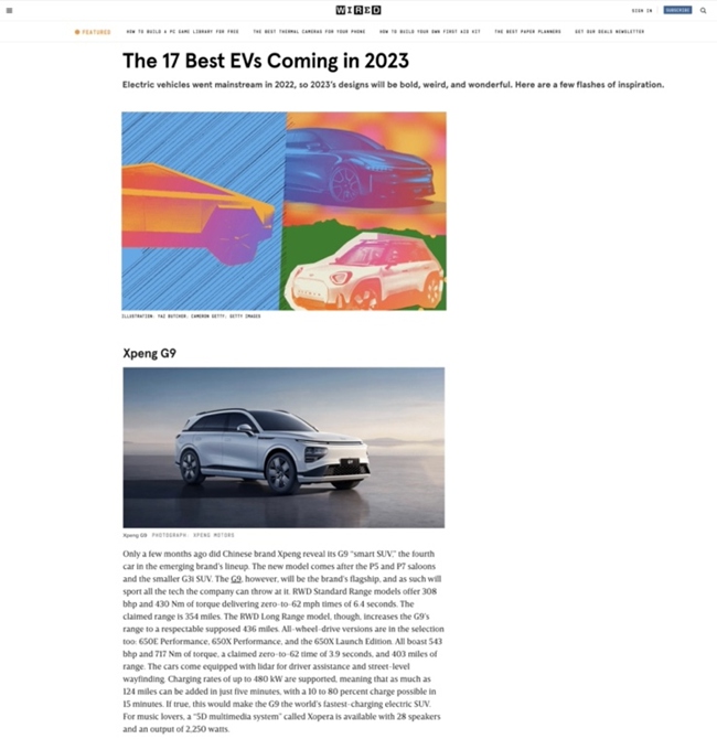近日,国际知名科技媒体WIRED(中文名“连线”)发布2023 Best EVs榜单,小鹏G9获选为2023全球最佳电动车之一。入选该榜单的包括特斯拉、劳斯莱斯、吉普等知名国际汽车品牌,小鹏汽车是唯一上榜的中国品牌。此次WIRED共评选出17款电动汽车,小鹏G9以极致的电动化和智能化体验入选。WIRED评价道:小鹏G9是一款“搭载了小鹏汽车所有最新的科技成果”的车型,同时也是“全球充电最快SUV”。