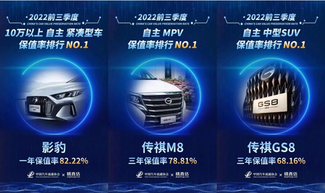 在中国汽车流通协会和精真估联合发布的《2022年度第三季度中国汽车保值率报告》中,传祺影豹、M8、GS8分别以82.22%的一年保值率、78.81%和68.16%的三年保值率登顶各细分市场榜单。
