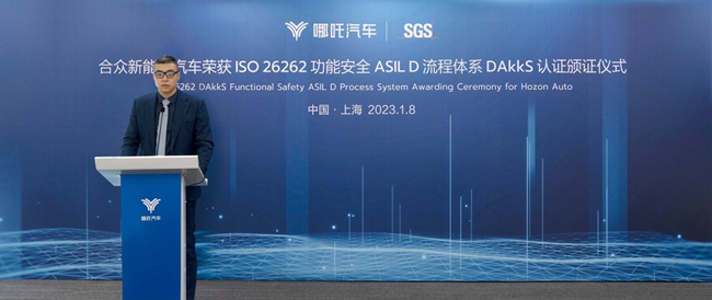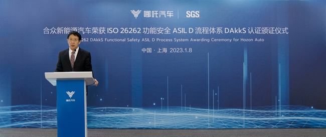 吕彬偲表示:“哪吒汽车以国际化标准进行产品研发、生产、发布、运营,严格把控全生命周期各个环节。此次高效地通过功能安全流程认证,印证了团队的执行力、公司的领导力,并增强了国内外汽车用户对哪吒汽车高标准产品开发过程的信心。未来,SGS将继续助力哪吒汽车在汽车新能源、智能化、互联网化领域的产品开发与认证,推动我国智能汽车产业变革与发展。”