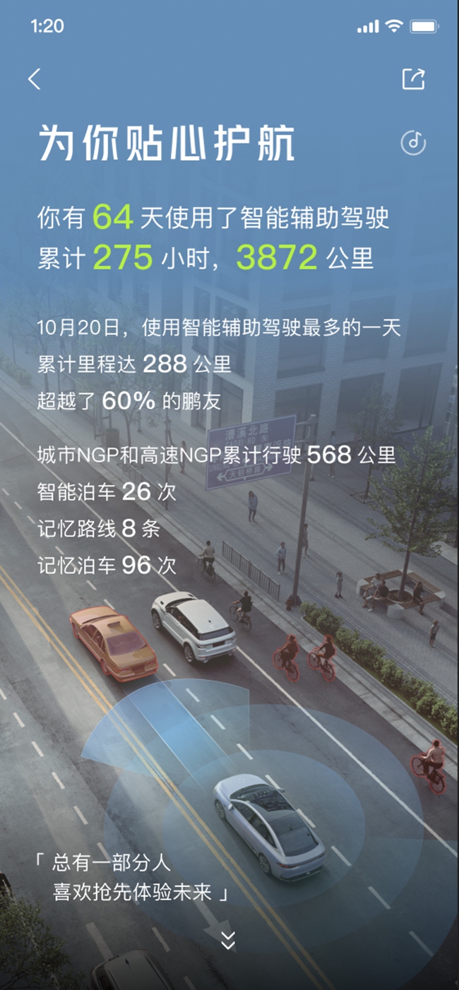 小鹏汽车APP社区将五湖四海的车主汇聚在一起,每每浏览,迎面而来更多的是归属感、共情感。踏入主页,点击进入小鹏年度用车报告,“HI 鹏友”将用户带回了2022年的点滴时光里。这一年,小鹏汽车智能导航开启总次数为227,562,658次,年度使用率高达99.65%;小P年度被唤醒总次数为236,385,059次,年度使用率达到99.88%;ACC总里程数更是出乎意料的达到153,342,644.7km;记忆泊车总路线数334,381次......这一连串的数字,由每一位鹏友共同参与汇聚!那在小鹏相伴出行的日子里,智能汽车都给你带来了哪些全新的体验?请回答你的2022......