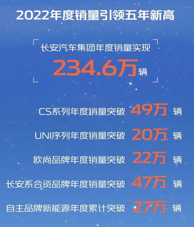 2022年,长安汽车实现销售234.6万辆,同比增长2.0%,创下近五年新高。其中,新能源销量快速增长,突破28万辆,同比增长160.5%,行业排名同比上升4位至第6位。同时,长安汽车三年保值率突破60%,品牌价值再创新高;售后满意度高达99.4%,创历史新高;在J.D.Power发布的IQS榜单中,长安汽车蝉联自主品牌第一。