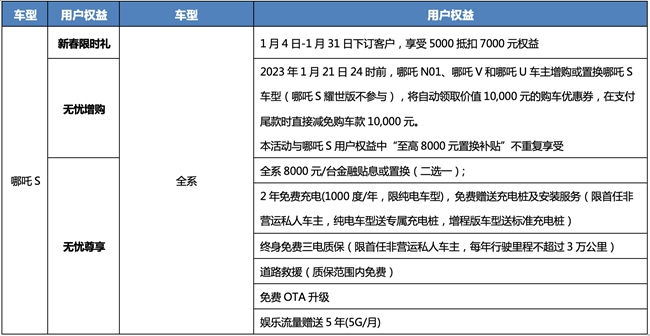 在越领同级的产品实力上,哪吒S还为新年购车用户带来了诚意满满的购车权益。1月4日-31日下订,可以享受5000抵扣7000元的“新春限时礼“;2023年1月21日24时前,哪吒N01、哪吒V、哪吒U的车主增购哪吒S,可享受量身打造的“无忧增购”好礼;此外,还有全系8000元/台金融贴息或置换(二选一)、娱乐流量赠送5年(5G/月)等“无忧尊享”礼遇,降低了购车、用车的门槛,让用户可以轻松畅享高品质电动出行体验,新年共赴新程。