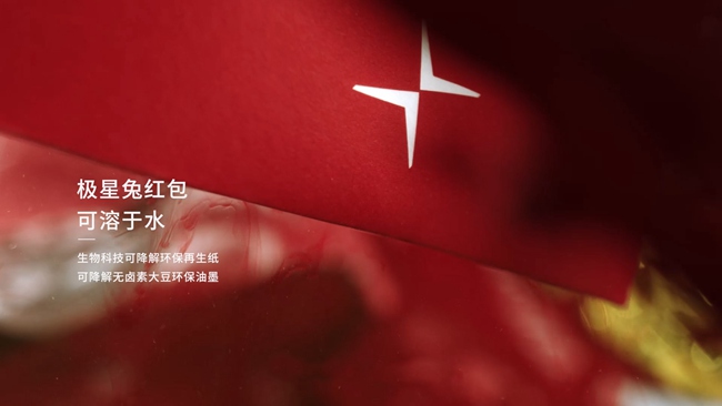 为了进一步诠释“纯净”年味,极星制作了可溶解的极星兔红包,采用可降解无卤素大豆环保油墨与可降解环保再生纸定制而成,不添加荧光剂等化学物质,既保留了红包年年换新的美好寓意,又不会对环境造成过多负担。