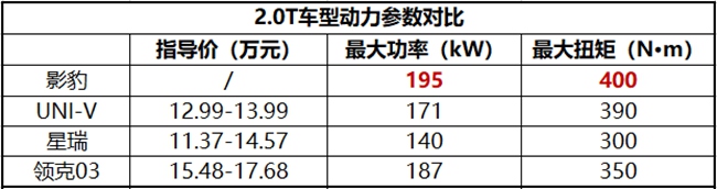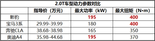 甚至对比30-40万级的BBA主流中型车发动机参数可以发现,影豹2.0T的参数同样占优,比宝马3系功率更高,比奥迪A4扭矩更大。