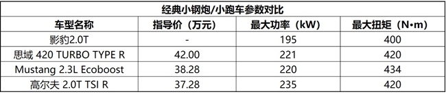 而拿着影豹2.0T与经典的钢炮车型思域TYPE R和高尔夫R,甚至是野马作对比时,影豹2.0T也一点儿不怵,在发动机参数上并未拉开太大差距。但对比价格层面,尽管影豹2.0T的价格还没有公布,但相信会维持在十几万级别,还不到思域TYPE R、高尔夫R和野马价格的一半。用十几万的价格享受接近顶级小钢炮的动力体验,也许,平民轿跑,真的要原地起飞了。
