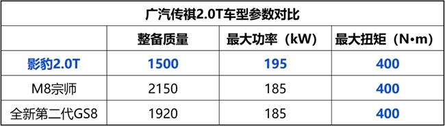 影豹2.0T版本目前只是公布了动力参数,还没有开放试驾。但不妨对它的动力表现进行猜想。影豹2.0T版本最大功率195kW,最大扭矩400N·m,这在传祺旗下2.0T的车型中,也是仅此一位。全新第二代GS8与M8宗师所使用的也只是最大功率185kW,最大扭矩400N·m的发动机,影豹2.0T版的最大功率还要多出10kW,相信是在全新第二代GS8和M8宗师发动机基础上进一步优化而来。
