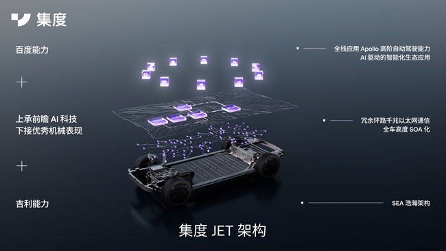 双方将立足集度智能化架构JET(JIDU Evolving Technology)发挥各自技术与资源优势,在智驾域(ACU)、整车域(BGM)、运动域(VDDM)等方面展开合作。同时,面向未来中央集成式架构的技术趋势,双方将持续探讨在新一代电子电气架构上的技术创新与联合研发。