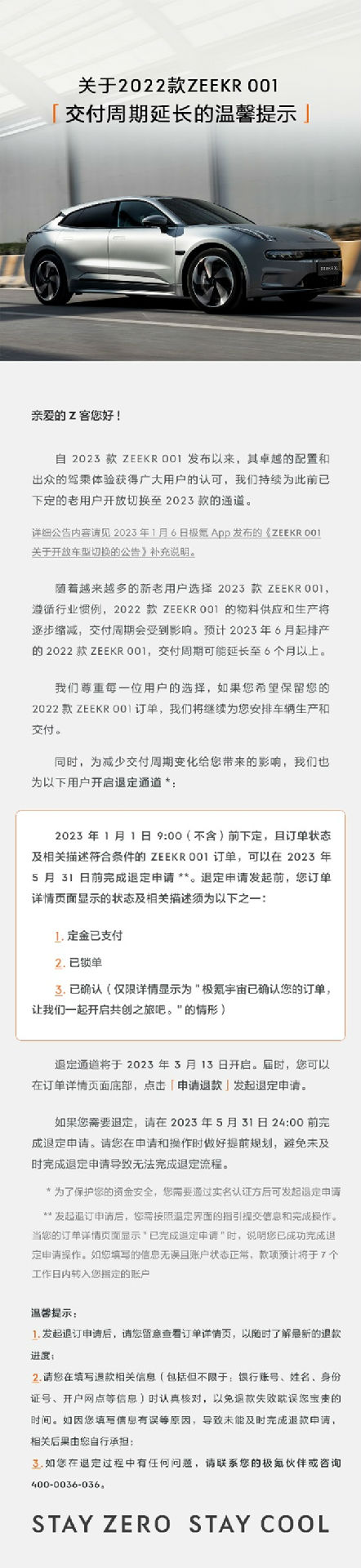 出于对用户利益的考量,以及对用户选择的尊重,对于希望保留2022款车型订单的用户,极氪将继续安排车辆的生产和交付;对于选择2023款车型的用户,继续开放订单切换通道;同时在2023年5月31日24:00前也可选择退定,退定通道将于2023年3月13日开启。