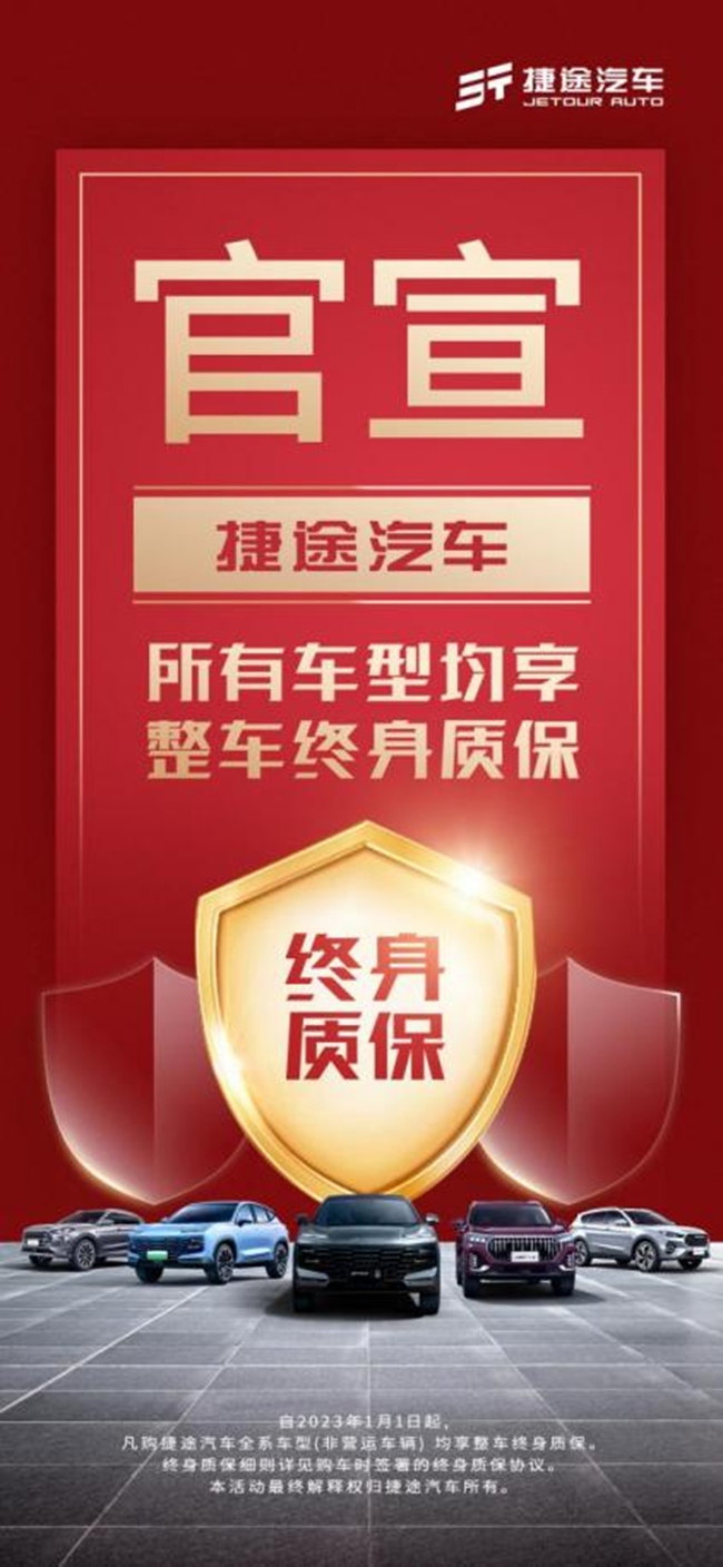 2月份,捷途汽车已经官宣了“全系车型整车终身质保”政策,打响2023年捷途汽车品牌向上征程的第一枪。一方面彰显了捷途汽车的品质自信、品牌自信,以及践行“以用户为中心”的理念;同时也打破了行业规则,彰显了捷途汽车创造更高品质标准与服务水平的愿景。