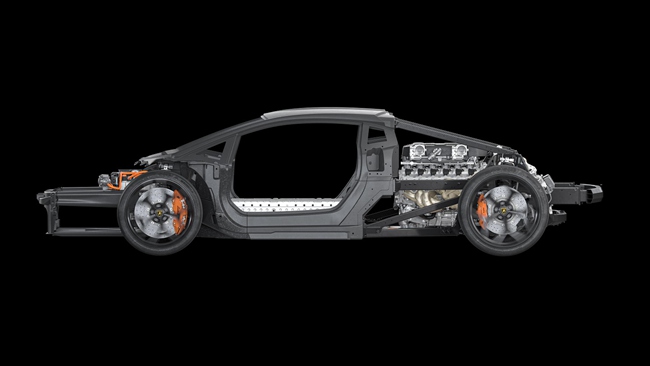 全新单体式车身研发的设计理念是基于对各部件最大程度的整合。得益于锻造复合材料技术的广泛引入,以及整体加强包围的研发,单体式车身得以优化。碳纤维的使用让LB744在超级跑车领域独树一帜:整体加强包围由碳纤维增强复合材料(CFRP)打造,构建起整车的支撑结构。整体加强包围连接起锻造复合材料元件,如前部结构件、前防火墙和A柱。