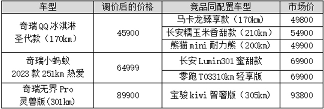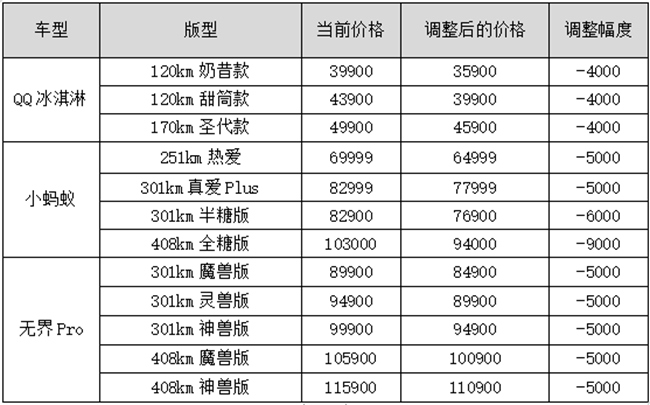 即日起,奇瑞新能源旗下三款主力车型价格正式回调。其中,奇瑞QQ冰淇淋官方价格回调幅度4000元,奇瑞小蚂蚁价格回调幅度 5000-9000元,奇瑞无界Pro 价格回调幅度5000元。