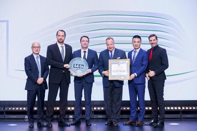 LEED认证是全球公认的可持续发展成就与领导力的象征。自 1998 年推出至今,LEED已成为世界范围内应用最广的绿色建筑及城市评估体系之一。该认证由美国绿色建筑委员会(USGBC)开发,采用认证级、银级、金级以及铂金级四个认证级别。USGBC & GBCI 北亚区董事总经理杜日生先生受邀出席活动现场,并为海宁保时捷中心授予铂金级认证:“海宁保时捷中心在各个方面贯彻绿色低碳的建造理念,不仅为顾客和工作人员营造更加优质、健康的环境,更是保时捷与捷成集团积极践行可持续发展战略的最好证明。期待我们能够在未来展开更多合作,共同推进汽车行业的可持续发展。”