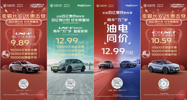 “长安百亿惠民购车季”福利全面开启,限时优惠仅9天,多重好礼限时享!一大波经典王炸车型摊牌见底,持续疯狂开挂补贴,时下特别火爆的,年轻人的第一台轿跑UNI-V 9.89万起;销量担当第二代CS75 PLUS 10.99万起;国民家轿逸动PLUS现金直降2万,一口价只要7.39万;甚至刚上市的新款UNI-V 智电iDD也加入钜惠,享受和UNI-V 2.0T同价礼遇,仅需 12.99万起。厂家直接担保,车企补贴卷出新高度,限时钜惠仅9天,抢先来袭!