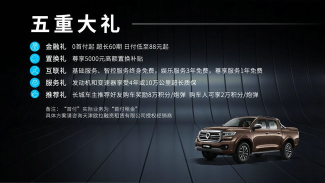 2023款乘用炮在智能、豪华、安全、舒适等方面再进阶,增配不加价,以冠军实力,在全球乘用皮卡赛道继续领跑。同时,2023款乘用炮还推出“金融礼、置换礼、互联礼、服务礼、推荐礼”五大购车礼,让用户尊享购车体验。