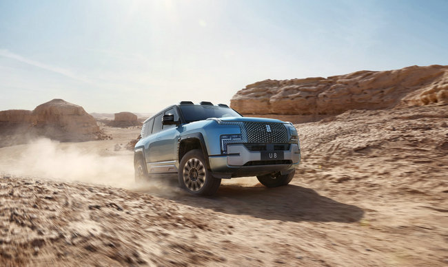 依靠易四方对四轮扭矩的独立矢量控制,U8可实现车辆的极致稳定和安全。超过1100匹的最大马力,让U8具备超强的越野实力,在阿拉善大V沟轻松完成沙漠干拔冲坡挑战。