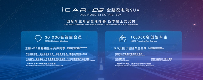 iCAR 03以业内首创结构,定义新能源时代全路况出行体验。本届上海车展,iCAR 03开启全球创始车主招募活动,此次创始车主限额10000名,铂金会员20000名,通过iCAR 汽车APP及iCAR官网即可抢订,还有多重惊喜福利等待领取,未来将会有更多的车主朋友加入到iCAR的大家庭中,与品牌携手共创美好车生活。同时iCAR联合中国国家地理,开启iCAR用户专属户外路线探享先锋官招募,旨在与追新年轻人共探精彩旅程。