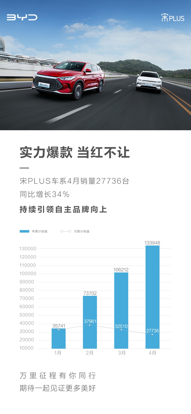 比亚迪官方数据显示,宋PLUS车系4月销量27736辆,同比增长34%。作为比亚迪海洋网的实力车型,宋PLUS车系持续保持稳定的热销势头,强有力的支持新能源SUV增长。进入2023年第二个季度,宋PLUS DM-i热度不减,依旧领跑紧凑型插混SUV市场。
